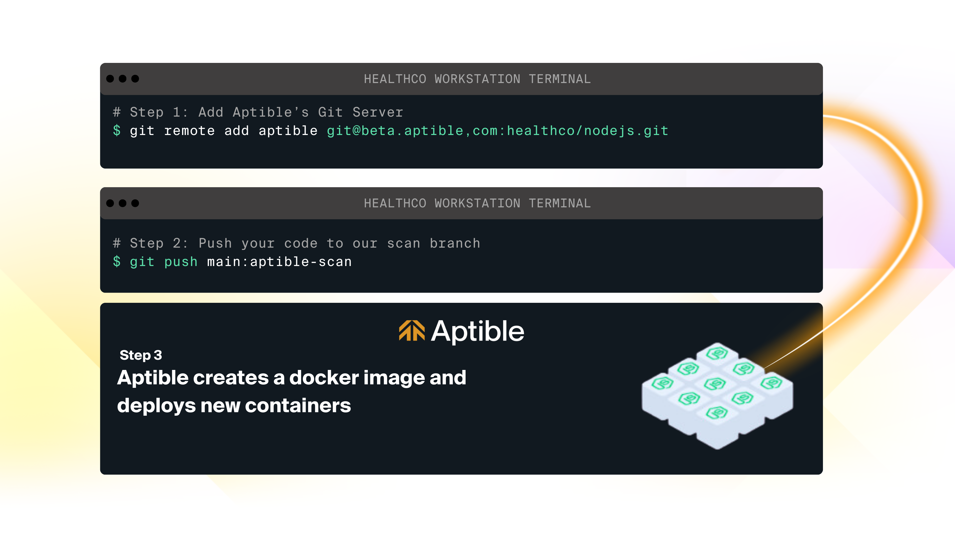 to push your code repository to a Git Remote provided by Aptible. - Aptible builds a new image from your Dockerfile and deploys it to new app containers