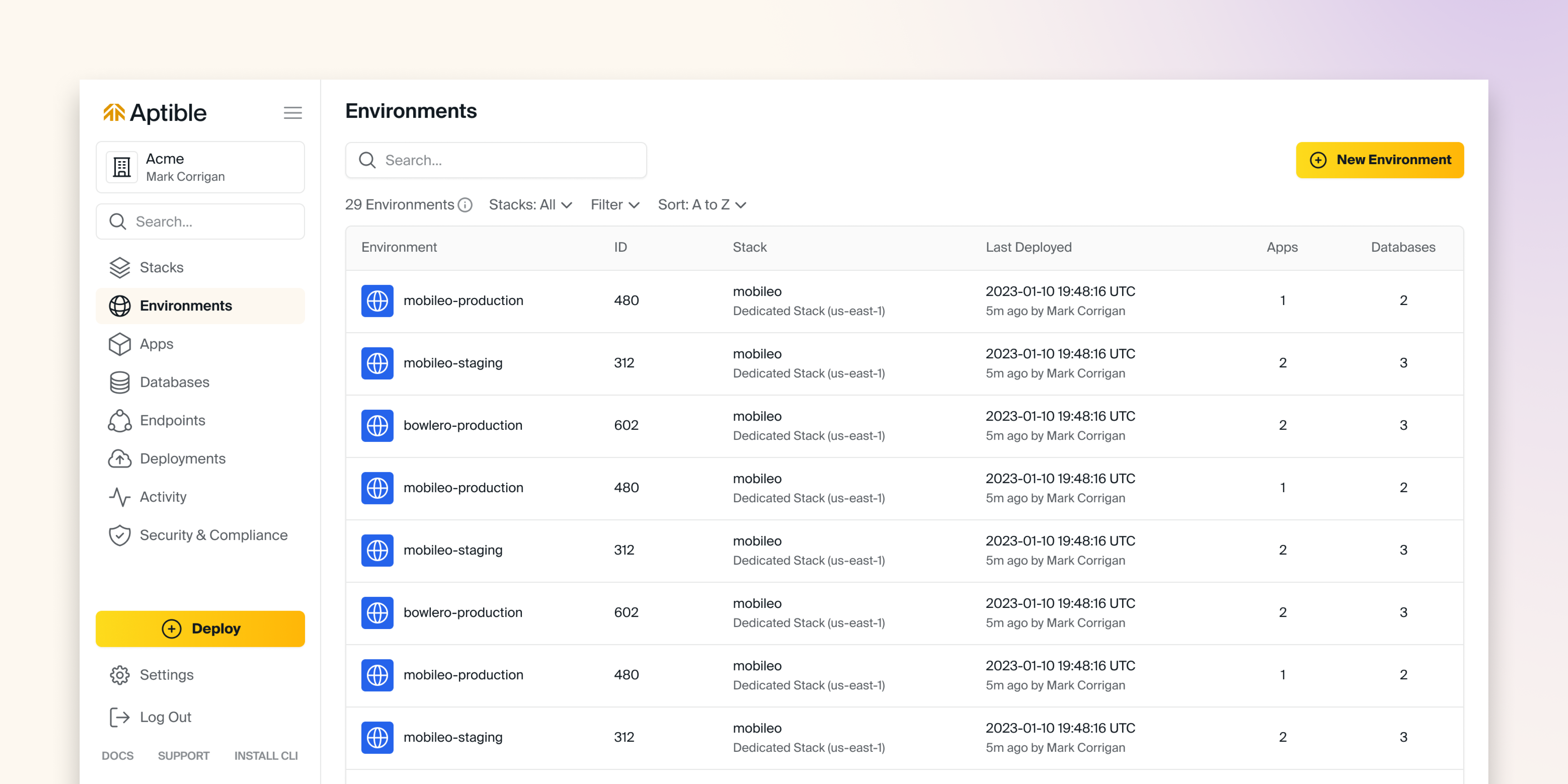 Environments can be renamed from the Aptible Dashboard within the Environment’s Settings.
