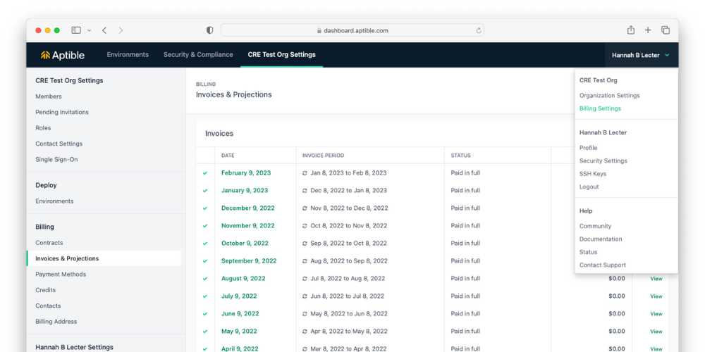 To review or modify your billing information, navigate to your account settings within the Aptible Dashboard and select the appropriate option from the Billing section of the navigation.Navigating Billing