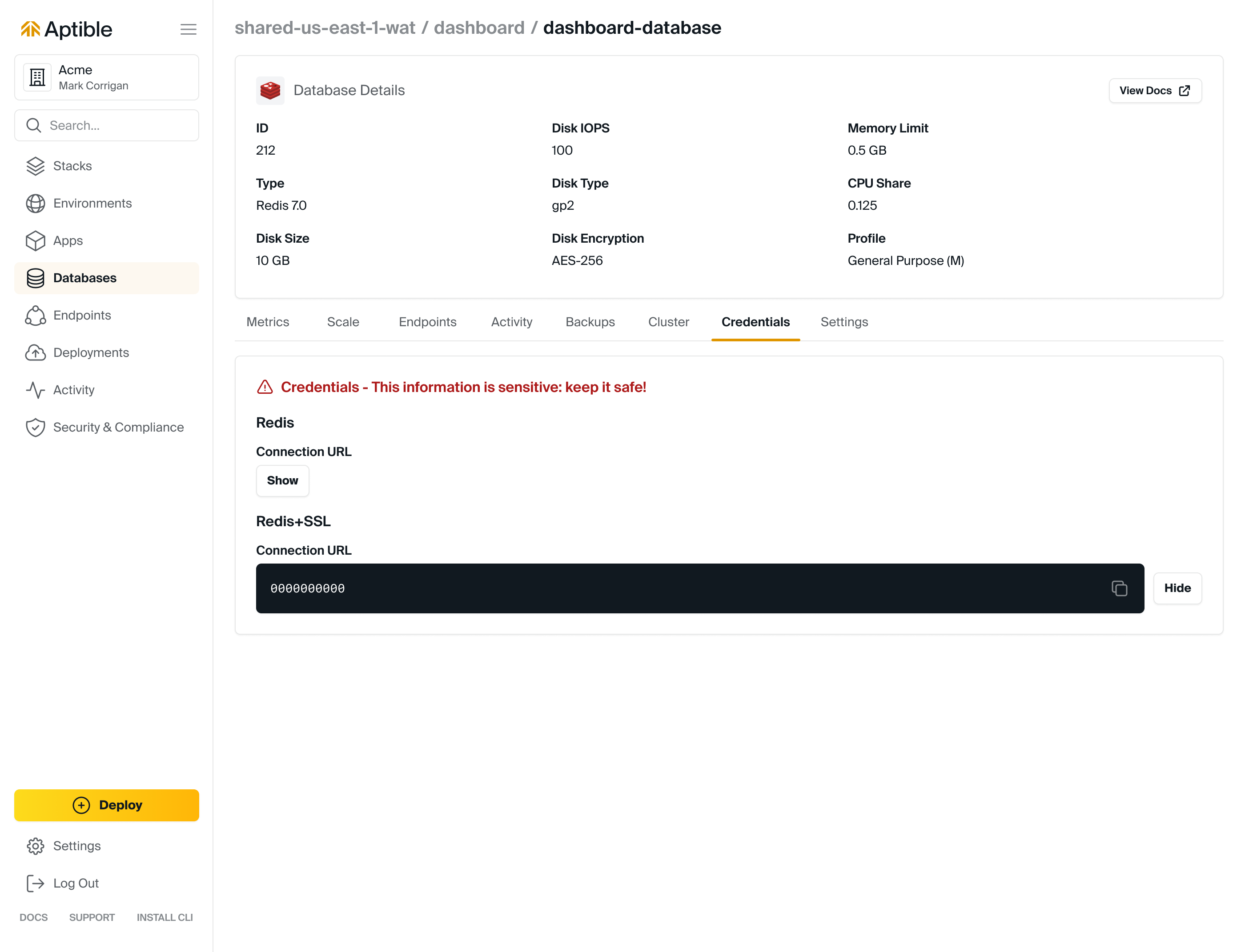 When you provision a Database on Aptible, you’ll be provided with a set of Database Credentials. The password in Database Credentials should be protected for security.
