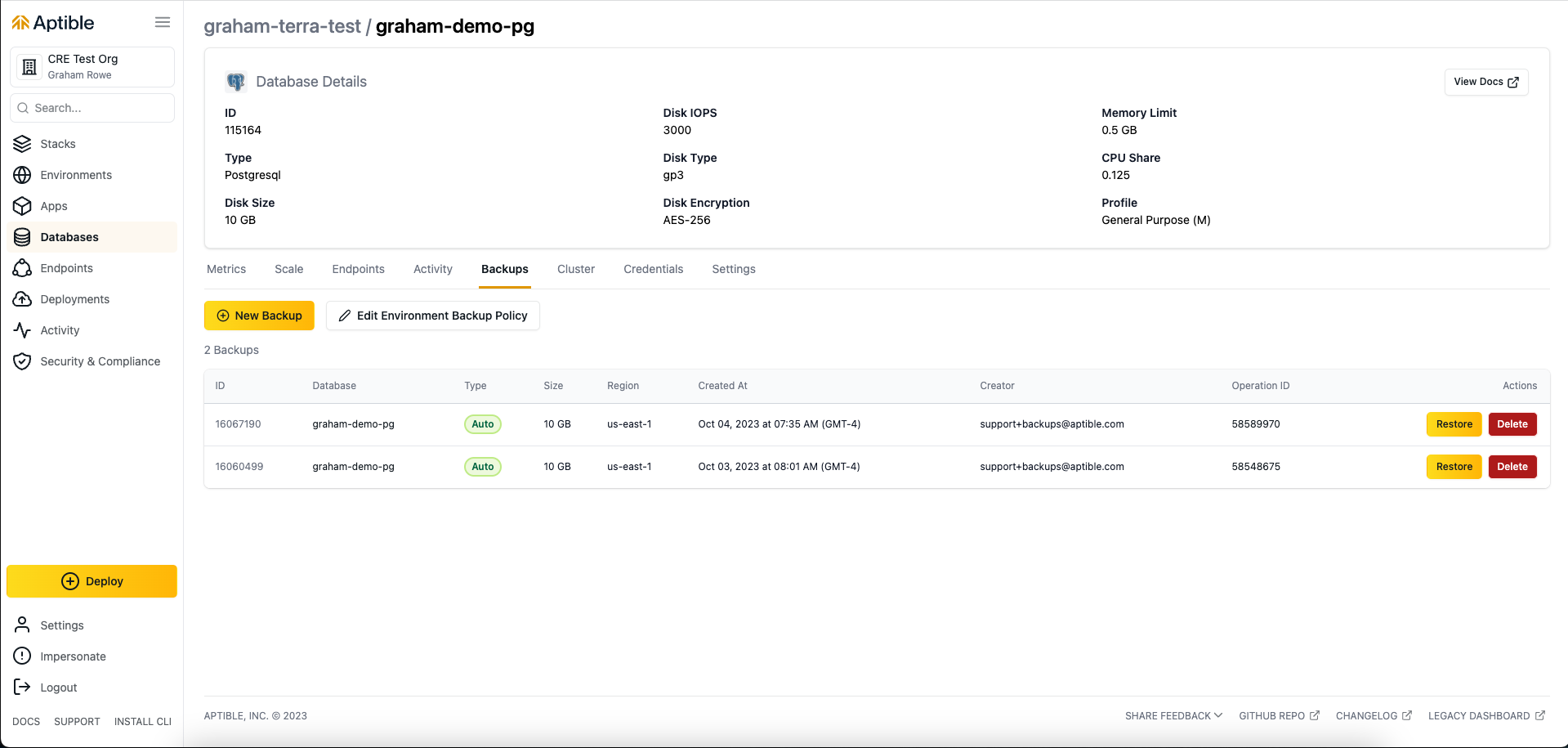 aptible backup:orphanedcommand - Within the Aptible Dashboard by navigating to the respective Environment > “Backup Management” tab > “Retained Backups of Deleted Databases”