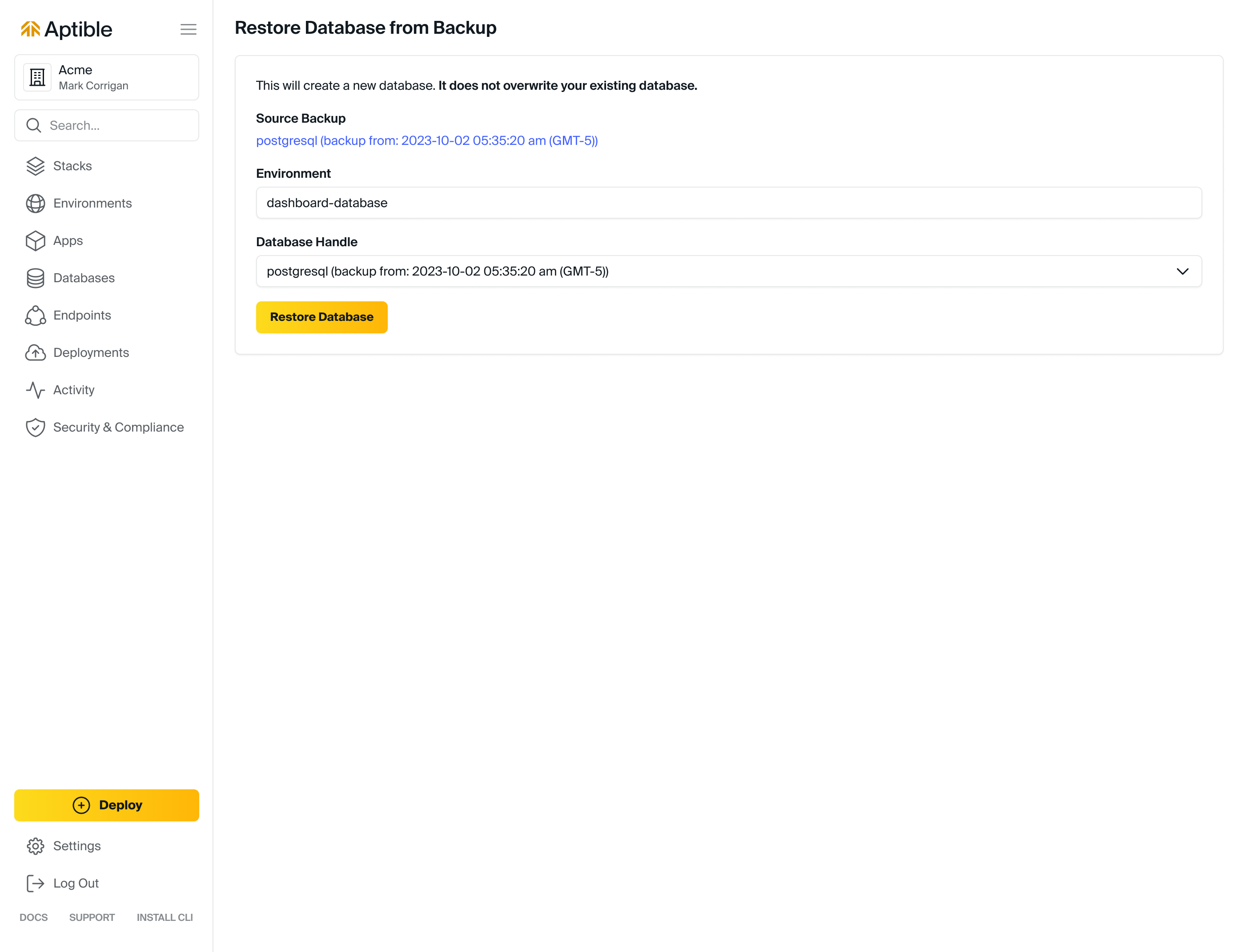 aptible backup:restorecommand - For Active Databases - Within the Aptible Dashboard by: