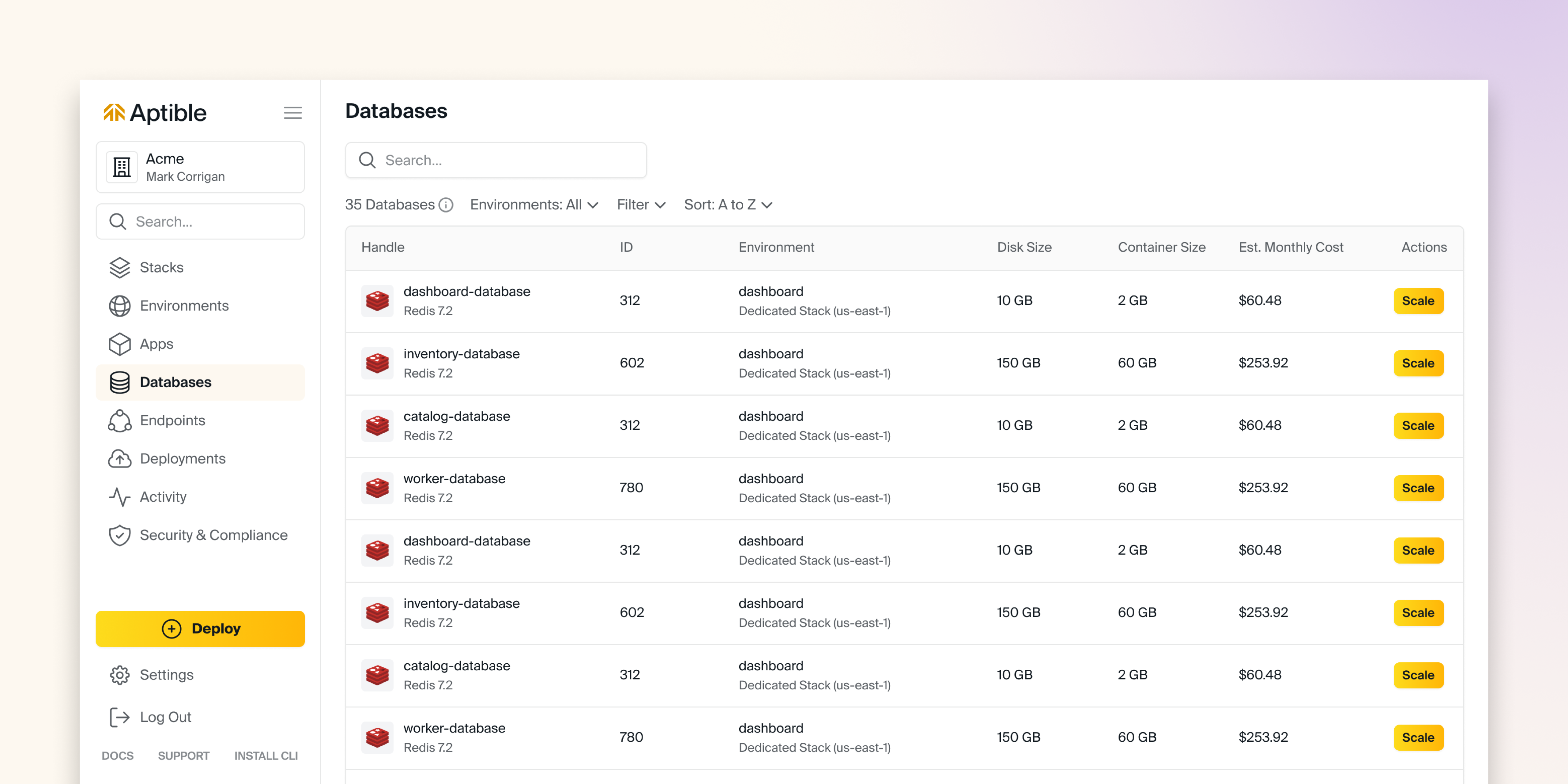 Aptible Databases provide data persistence and are automatically configured and managed by Aptible — including scaling, in-place upgrades, backups, database replication, network isolation, encryption, and more.Learn more about using Databases on Aptible