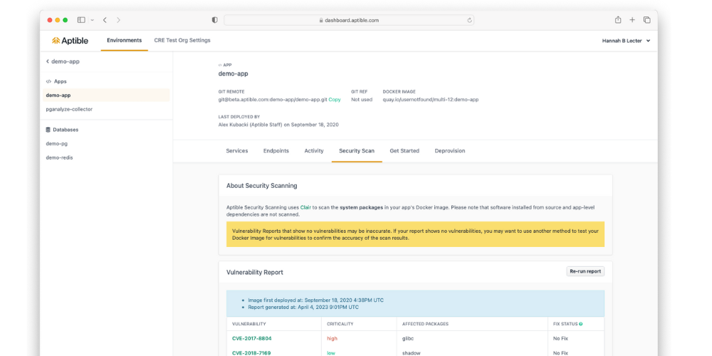 Access Docker image security scans in the Aptible Dashboard by navigating to the respective app and selecting “Security Scan.”