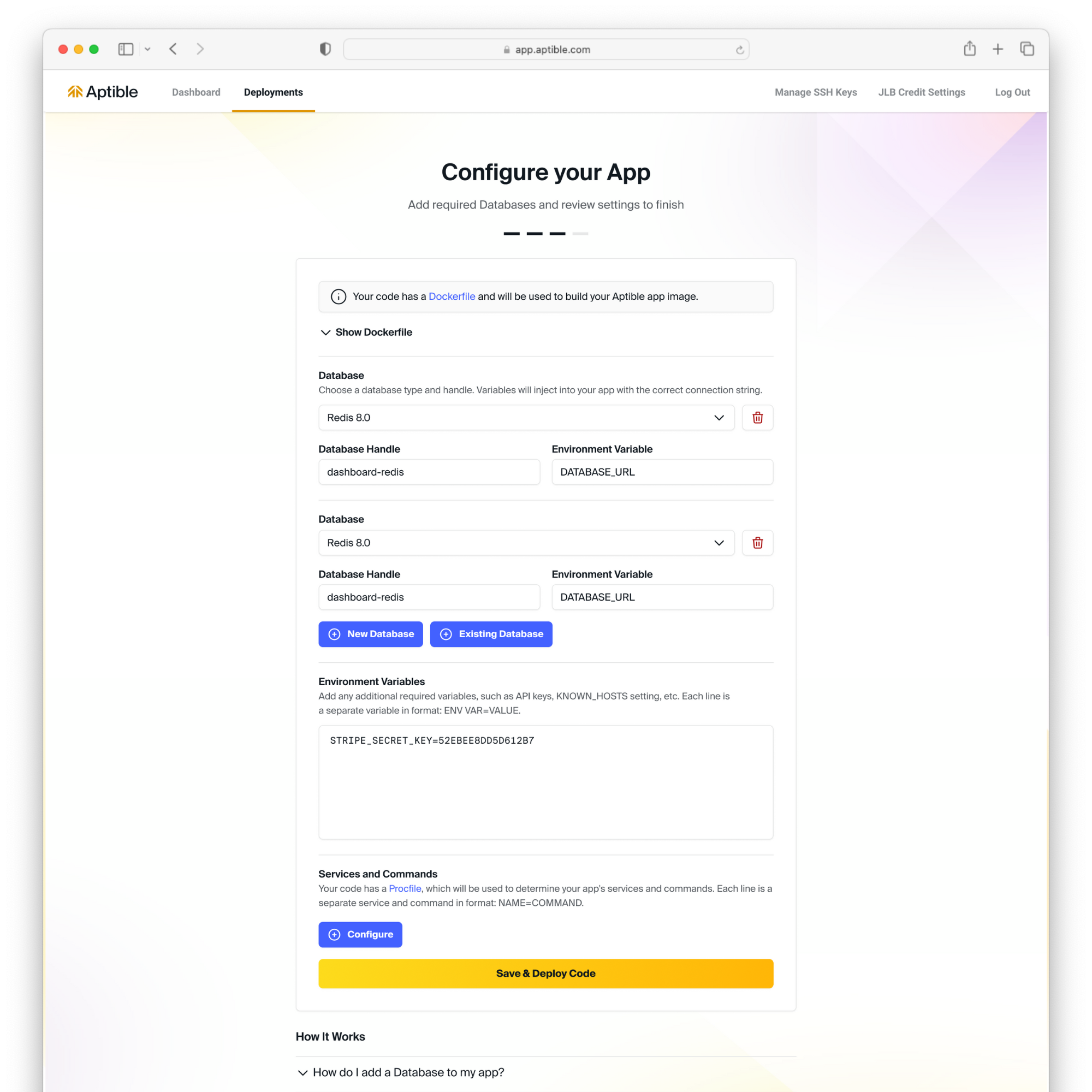 The following guide is designed to help you deploy custom code on Aptible. During this process, Aptible will launch containers to run your custom app and Managed Databases for any data stores, like PostgreSQL, Redis, etc., that your app requires to run.Compatibility