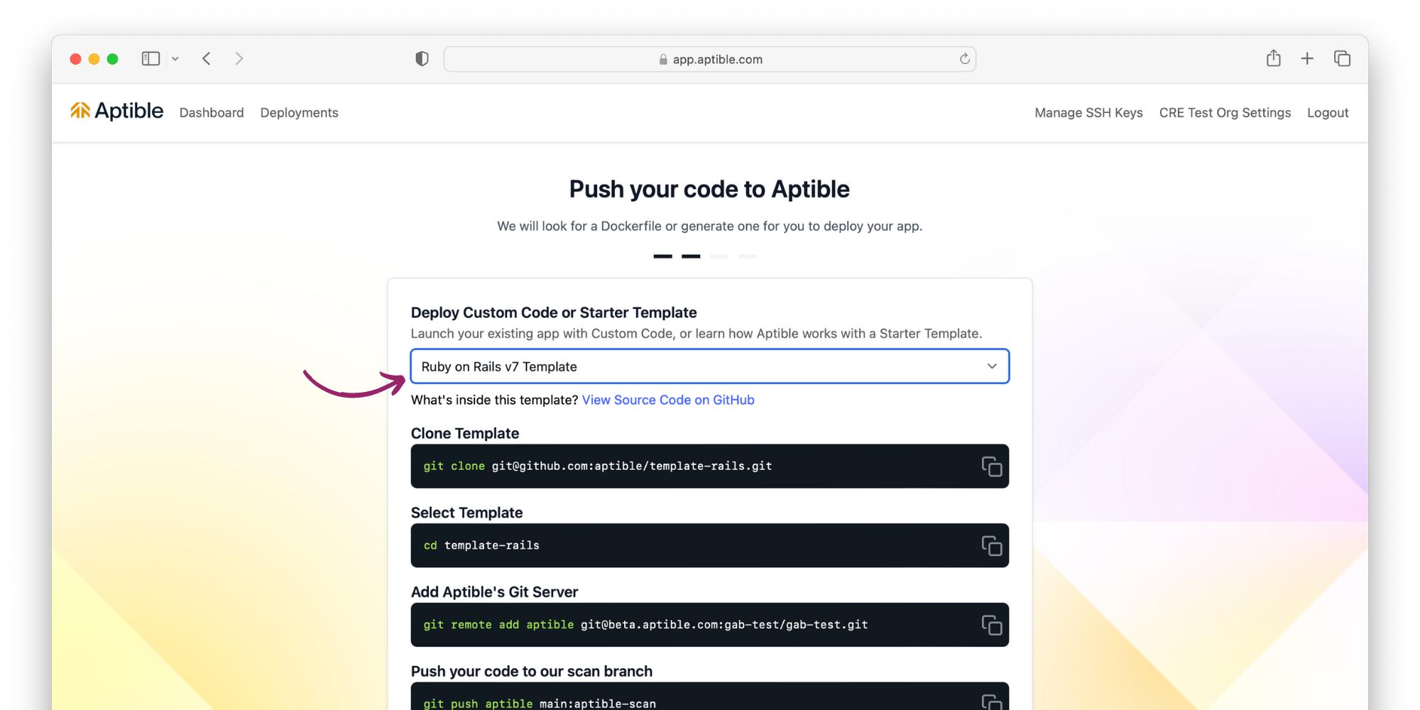 This guide will walk you through the process of launching the Rails Getting Started example from the Aptible Dashboard.Deploying the template