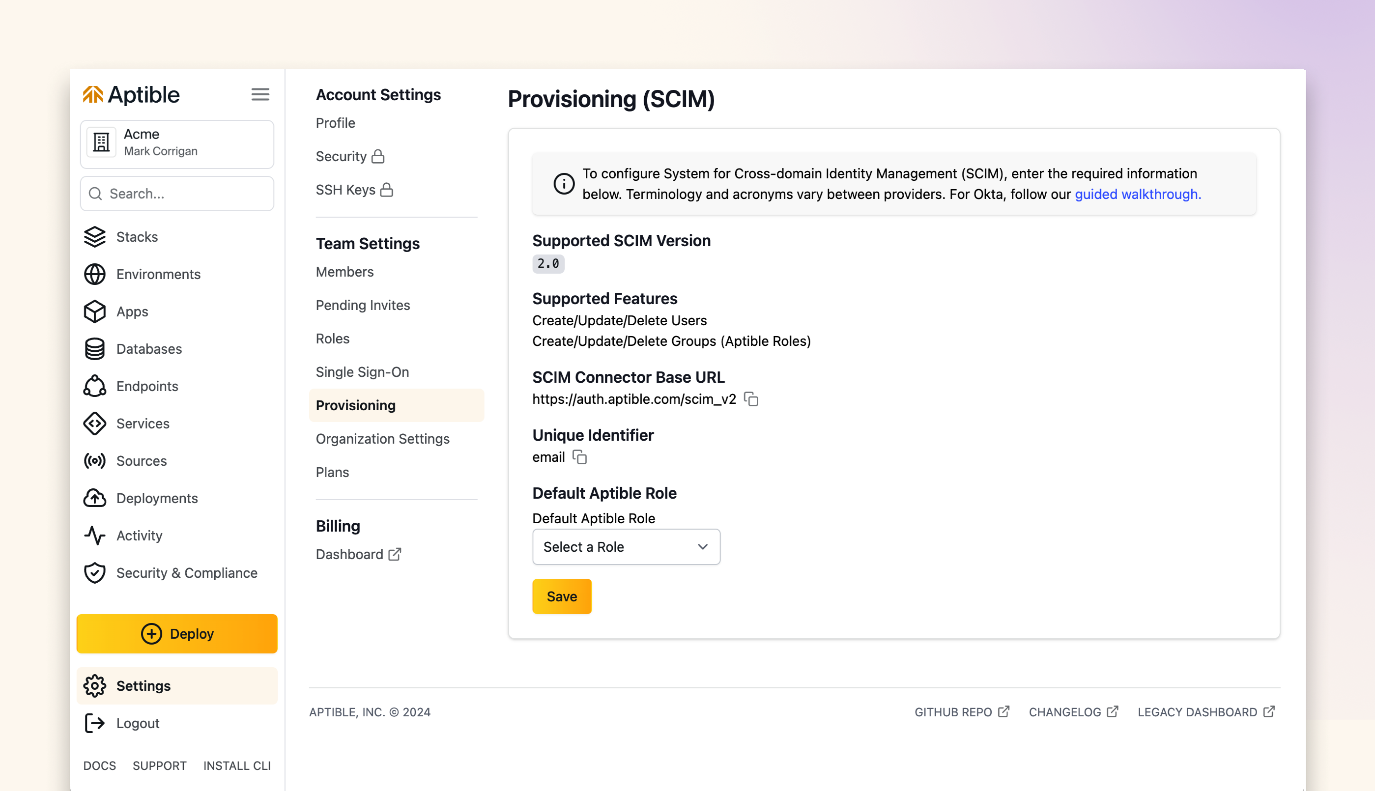You must be an Aptible organization owner to enable SCIM for your organization.