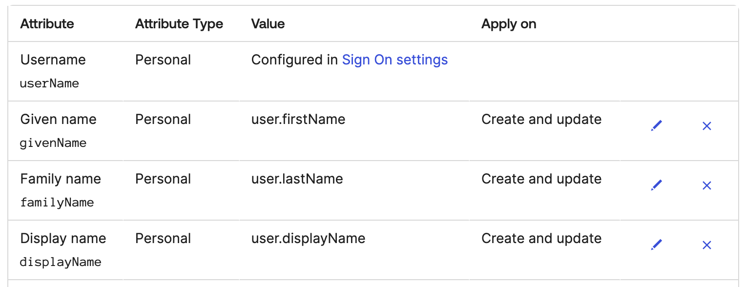 - Make sure only the Username, Given name, Family name, and Display Name attributes are mapped. Display Name is used if provided. Otherwise, the system will fall back to givenName and familyName. Other attributes are ignored if they’re mapped.