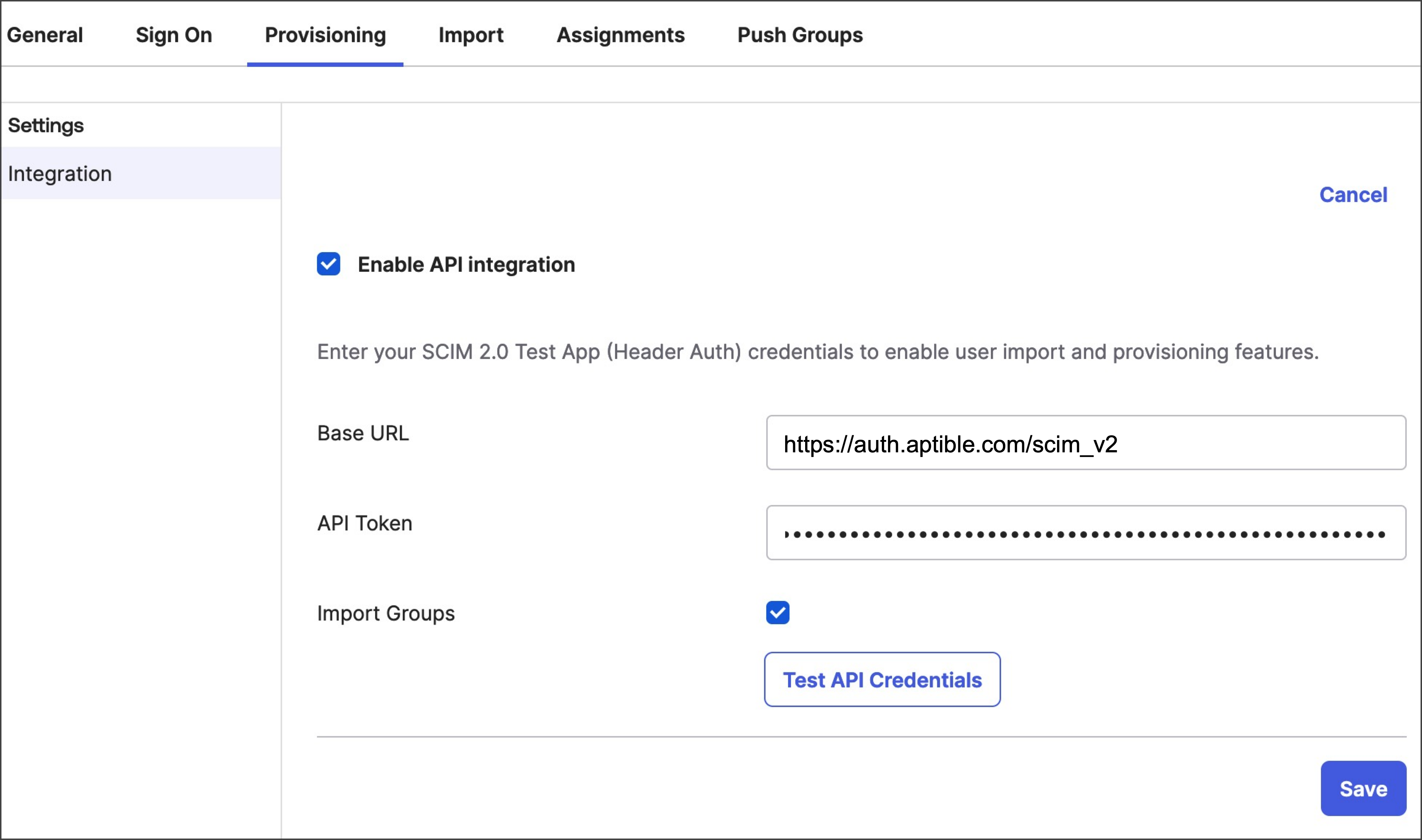 The SCIM 2.0 test app (Header Auth) is available in the Okta Integration Network, allowing you to enable user provisioning directly through Okta. Prior to enabling SCIM in Okta, you must configure SSO for your Aptible account To set up provisioning with Okta, do the following:- Ensure you have the Aptible SCIM token generated in the previous step.