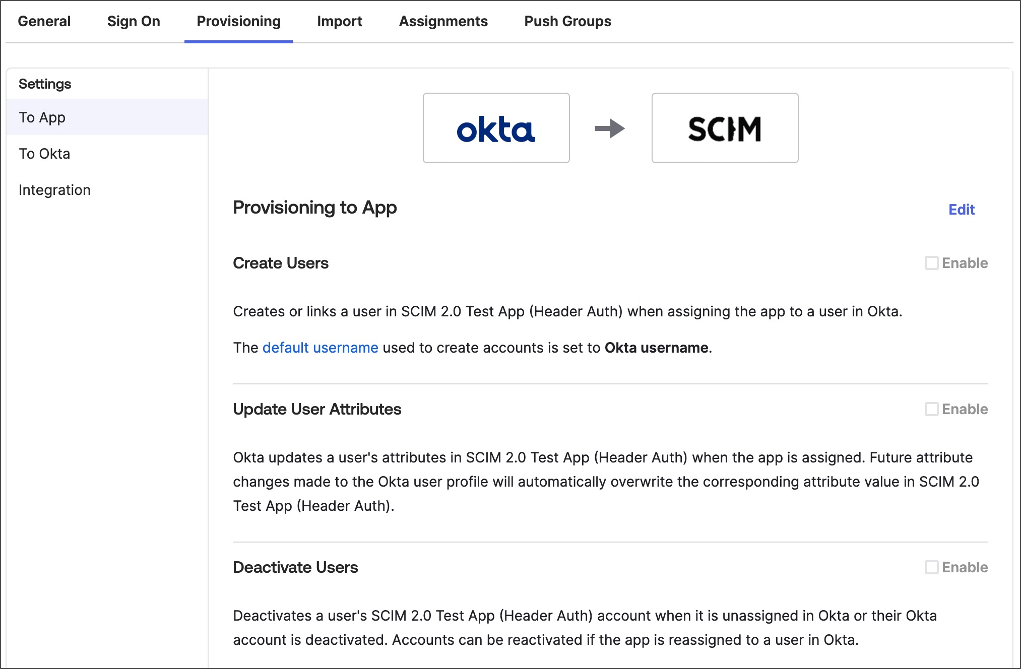 After you enable SCIM in Okta with the SCIM 2.0 test app (Header Auth), you can configure the app. The SCIM 2.0 test app (Header Auth) supports the provisioning features listed in the SCIM provisioning overview. The app also supports updating group information from Aptible to your IdP. To turn these features on or off, do the following:- Go to the SCIM 2.0 test app (Header Auth) in Okta, select Provisioning, select To App on the left, then select Edit.