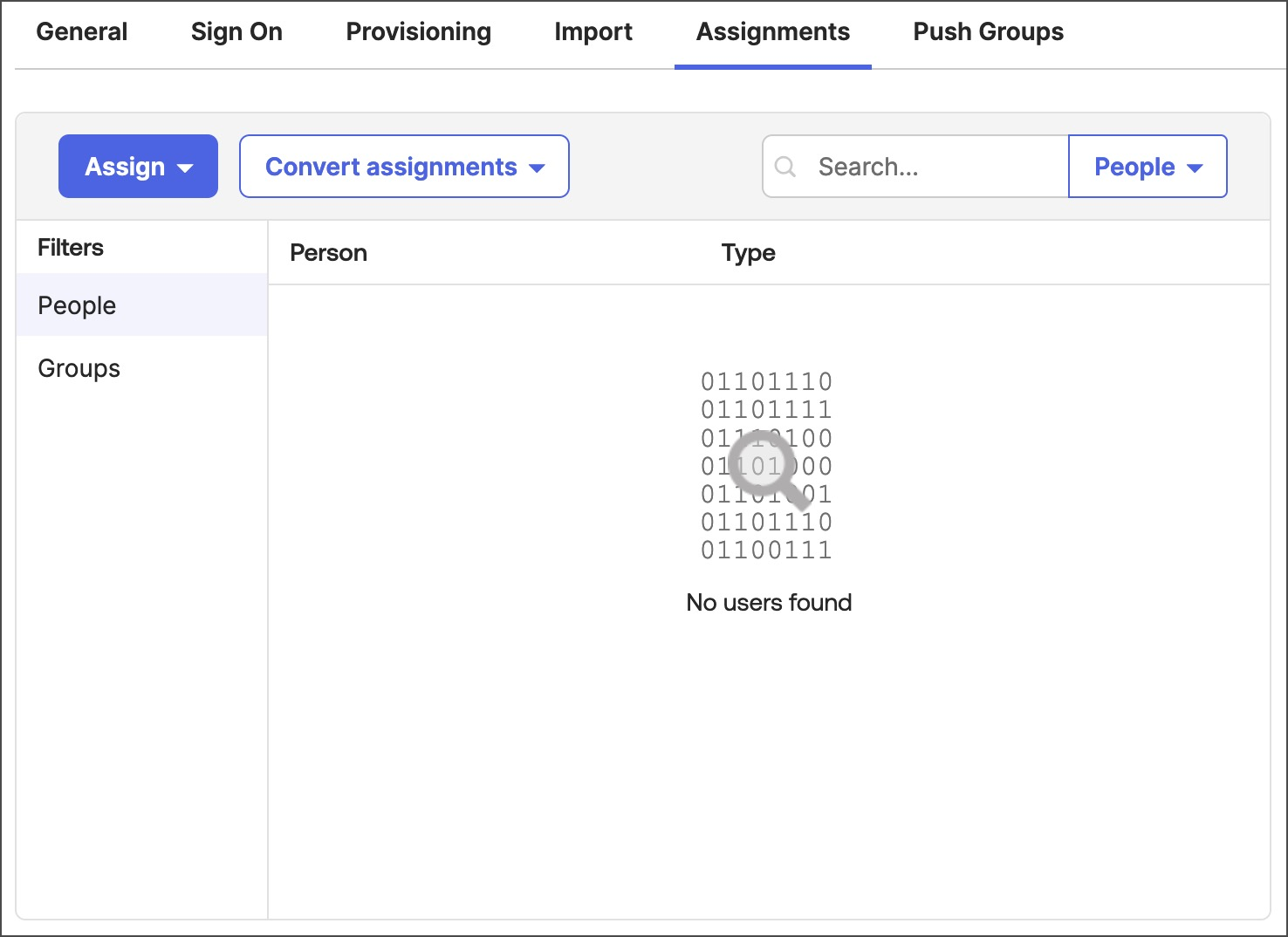 - Select Assignments, then assign relevant people and groups to the app. Learn how to assign people and groups to an app in Okta.