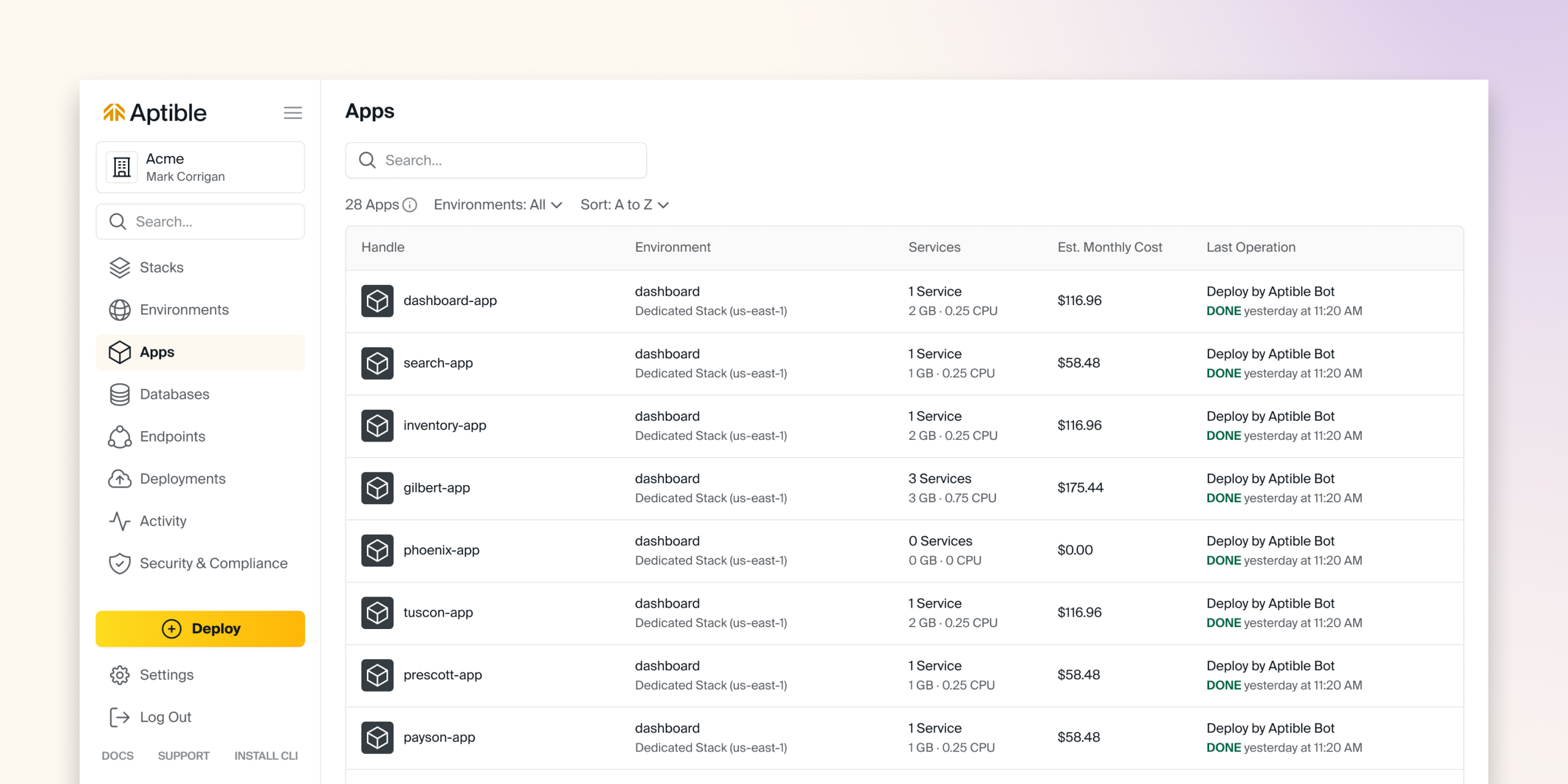The Aptible Dashboard is organized to provide a view of resources categorized by type: stacks, environments, apps, databases, services, and endpoints. On each resource page, you have the ability to:- View the active resources to which you have access to with details such as estimated cost