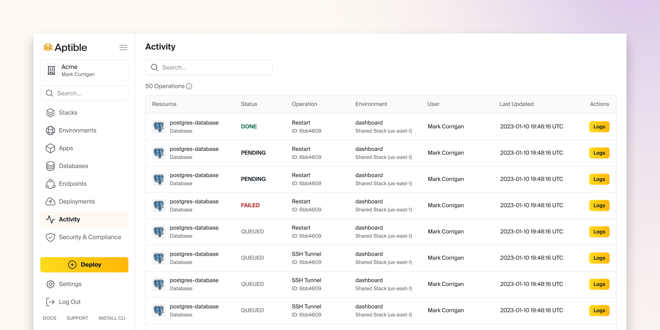 Troubleshooting with our team? Link the Aptible Support team to the logs for the operation you are having trouble with
