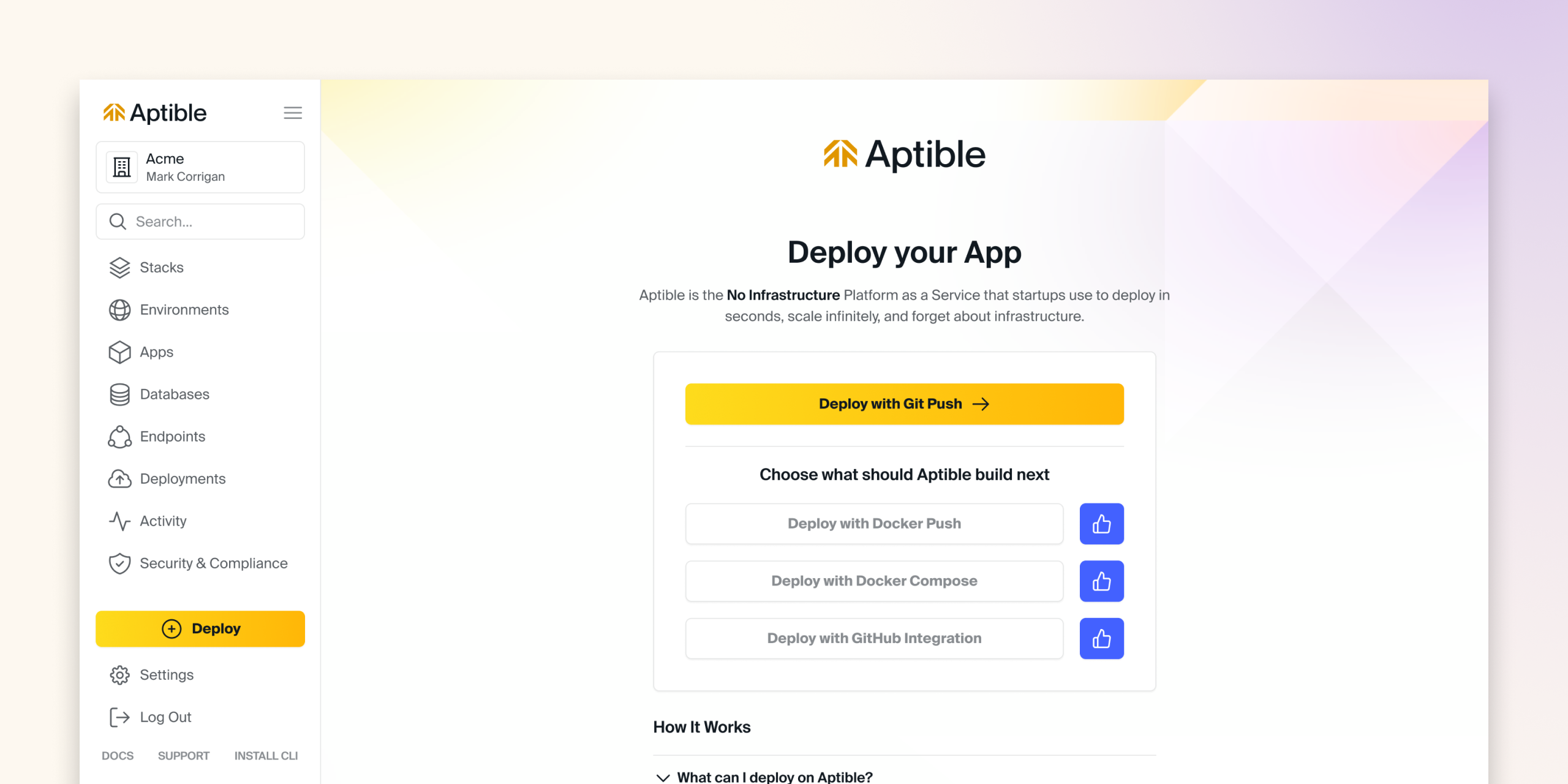 When you first sign up for Aptible, you will first be guided through your first deployment using one of our starter templates or your own custom code. Once you’ve done so, you will be routed to your account within Aptible Dashboard.Sign up for Aptible